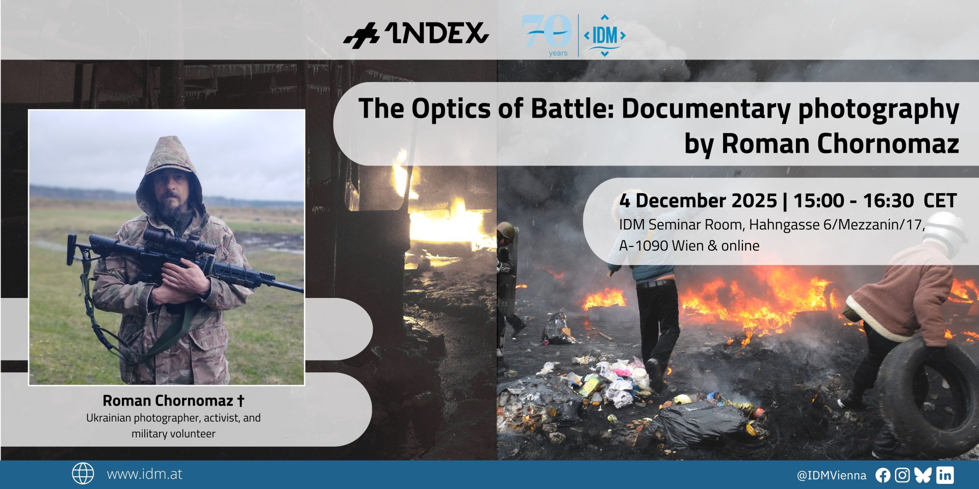 Запрошуємо на меморіальну виставку робіт Романа Чорномаза «Оптика бою» з коментарями від Саші Довжик та Себастьяна Шеффера, директора IDM, що відбудеться 4 грудня. Роман Чорномаз був українським фотографом, активістом і військовим волонтером з позивним «Корсар». Він загинув з 12 на 13 червня 2023 року на Донеччині. Раніше виставка Чорномаза експонувалася у просторі INDEX у Львові, а тепер буде представлена в IDM.